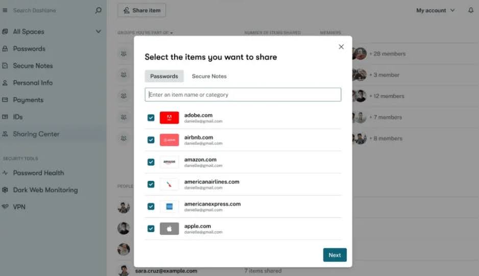 For families and small businesses, this is invaluable. Instead of emailing or messaging passwords, which is extremely insecure, you can share them directly inside Dashlane with end-to-end encryption intact.